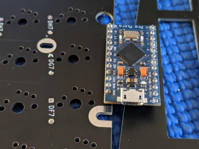 . . . ![]() I'm actually going to be using a Mainframe for this build, but since I have an Elite-C handy, I'll slide it into the Rebound Pro Micro Adapter and onto the PCB for testing. ![]() If you haven't already added legs to your microcontroller, use these straight holes on the edges of the PCB and plate to align your header pins. ![]() Solder the header pins to your microcontroller and trim them flush. ![]() Insert MCU into the adapter. . . . Return to the main guide |
